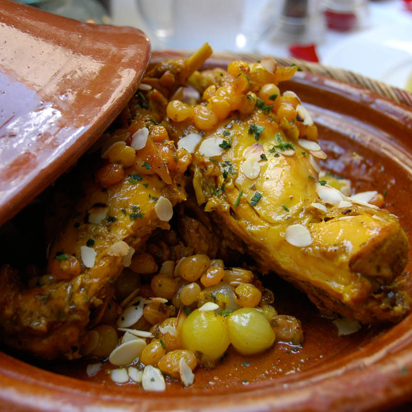 Die marokkanische Küche spielt viel mit süß-salzigen Kombinationen: Klassiker sind die Tajine mit Lamm und Quitten oder Trockenfrüchten, die Tajine Maqfoul mit karamellisierten Tomaten auf Lammfleisch. Eine besondere Geschmacksrichtung gibt die salzig eingelegte Zitrone als Beilage zum Huhn mit Oliven.