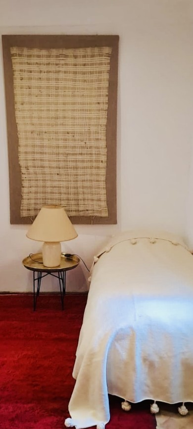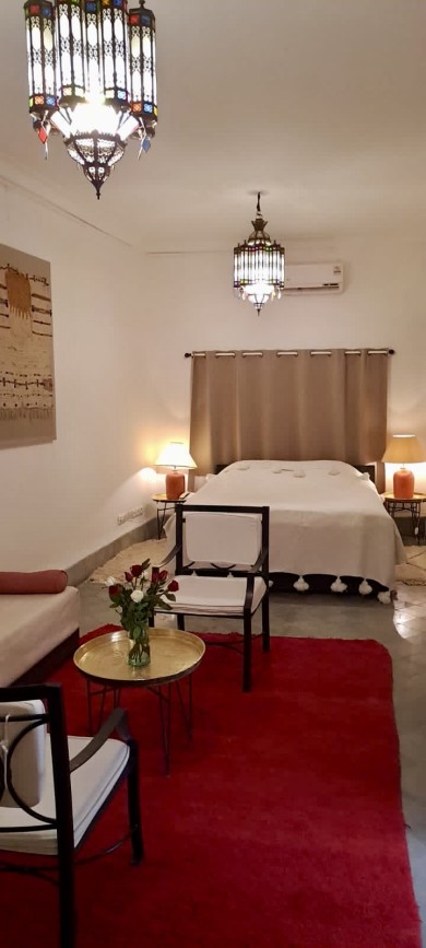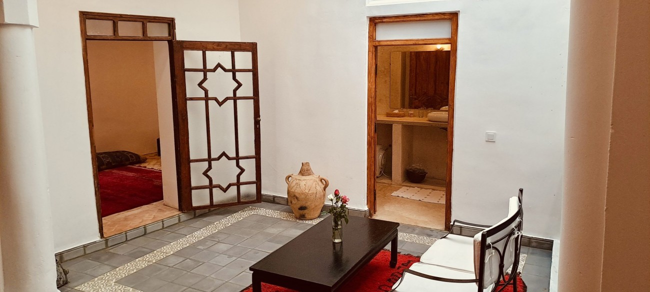 Grande chambre à coucher (env. 40 m2) avec une armoire baroque et des textiles berbères. Autre chambre à coucher avec lit double. Cour intérieure couverte avec coin salon. Salle de bain avec douche. La chambre est climatisée. La suite est plus simple en décor que les autres suites junior, mais elle est spacieuse avec 2 chambres à coucher séparées et convient donc bien aux familles avec de jeunes enfants.