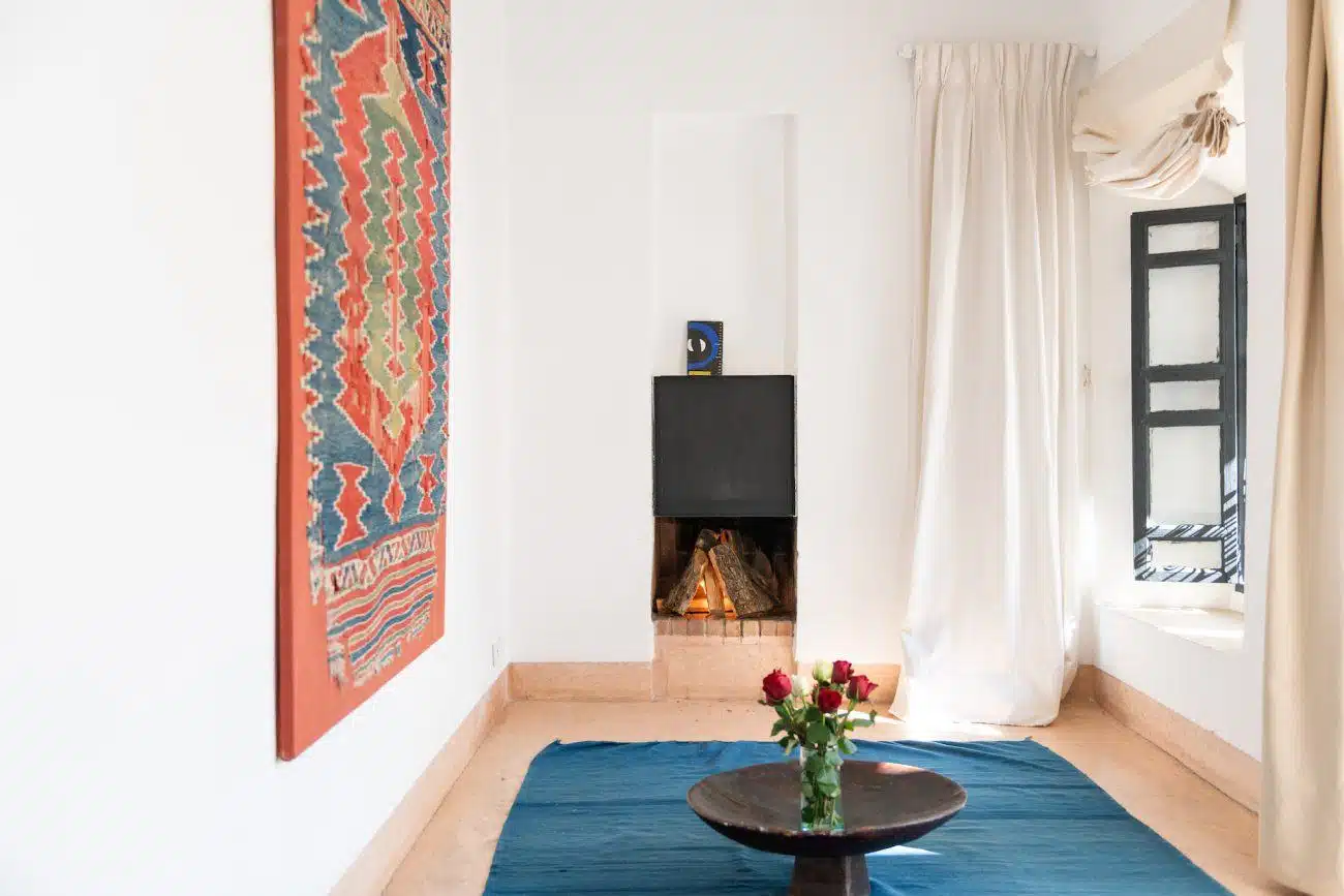 The Blue Room is situated on the ground floor. The Blue Room’s bathroom on the same floor next to the bedroom is equipped with a shower. The bedroom is not air-conditioned, but thick walls keep you cool in summer and a fireplace warm in winter. Stairs lead up to the first floor to the Kilim Room on the first floor with fireplace and air conditioning boasts of a small balcony facing the small Blue House courtyard. The private bathroom with bathtub is next to the bedroom also on the same floor.