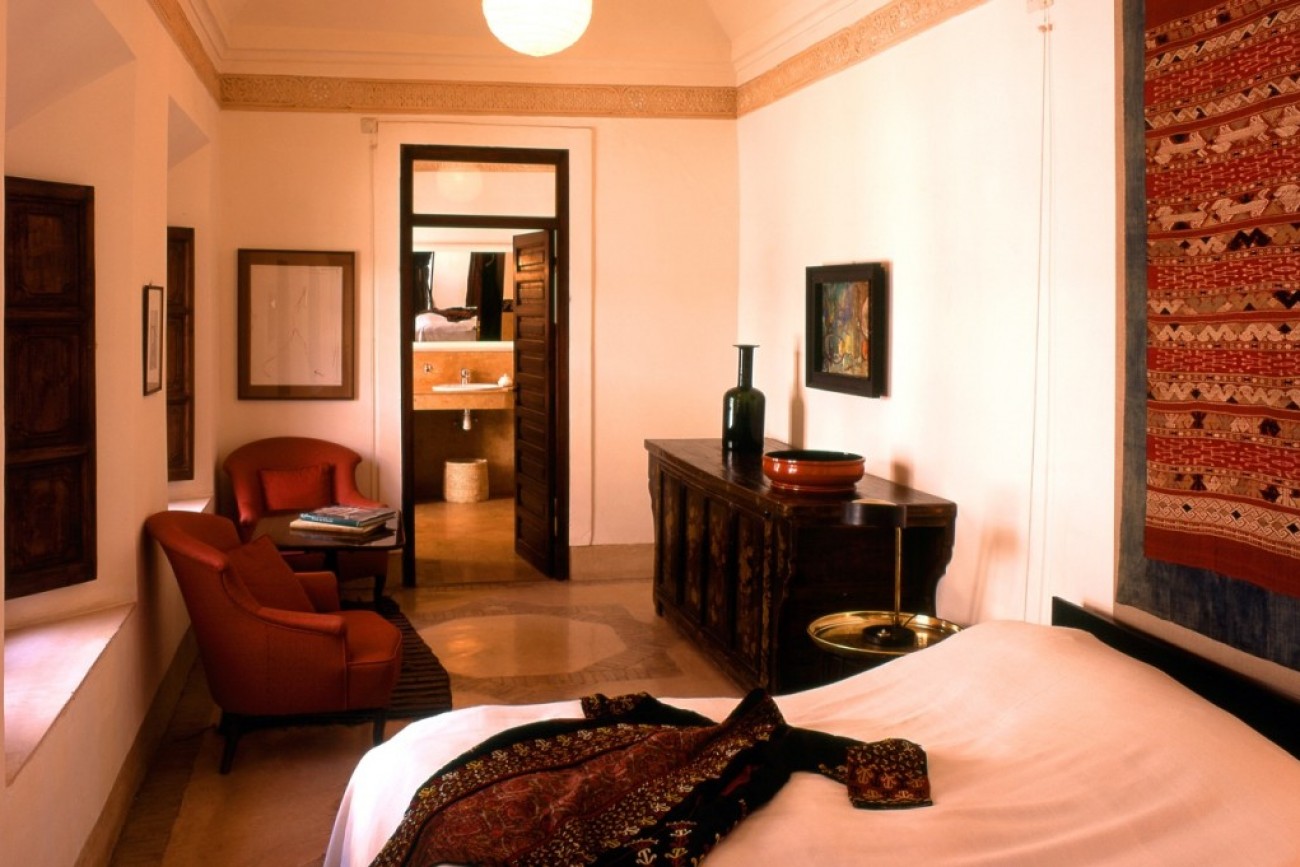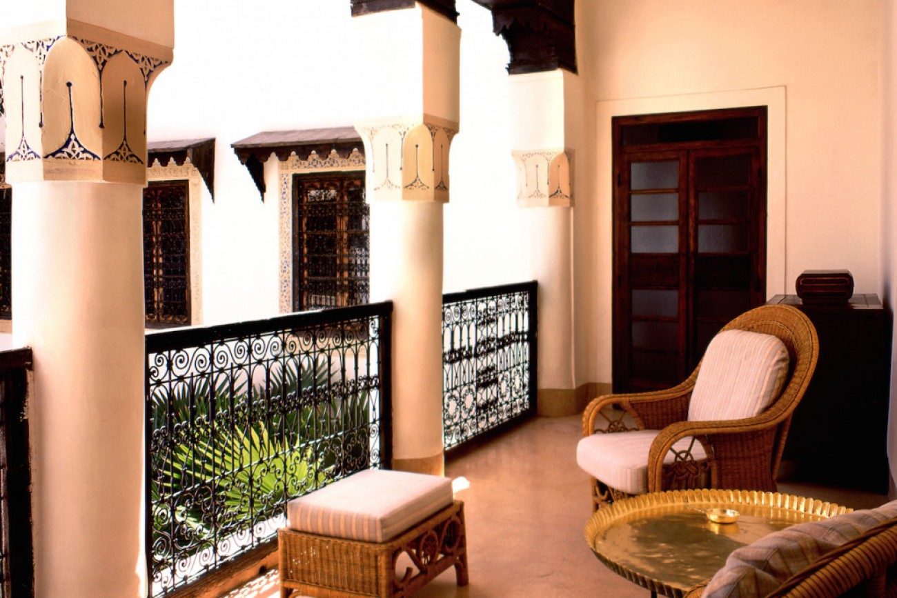 Spacious Suite furnished with antique Chinese chest and cupboard and decorated with Berber textiles. The roomiest bathroom of the riad with shower and separate bathtub leads to the generously sized private balcony overlooking palm trees and bananas in the quiet Palm Courtyard.