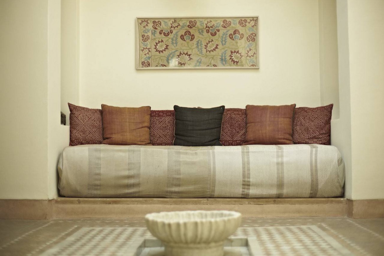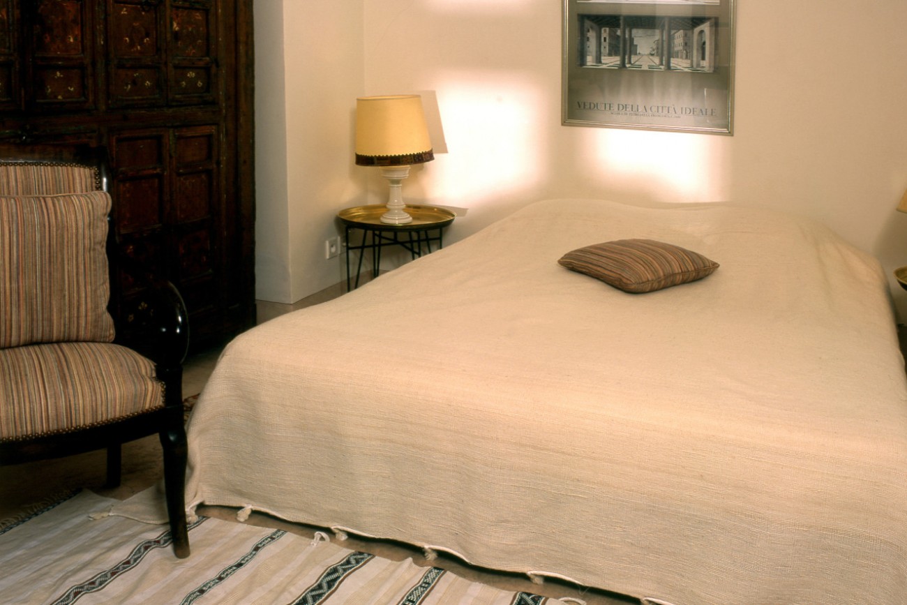 Air-conditioned bedroom (bed 160 x 200 cm) with tradtional Berber closet. Approx. 60 sqm living room with writing desk, sitting area. Kitchenette with minibar.