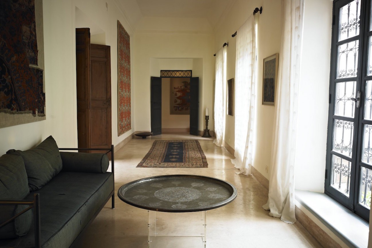 Gallery decorated with Ottoman textiles and view on the patio and its orange trees. Bathroom with bath tub.