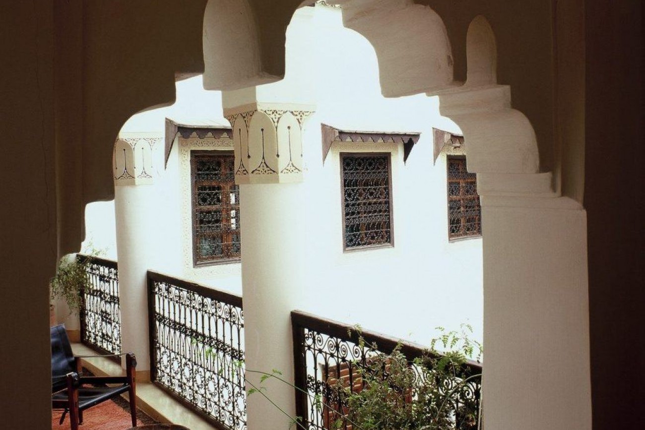 Generously sized suite of bedroom and spacious living room in addition to a private balcony. The air-conditioned bedroom (bed 160 x 200 cm) overlooks the pool and is furnished with an antique Berber closet. Bathroom with bath tub and separate WC. The large air-conditioned living room (approx. 60 sqm) with fireplace, sitting area, writing desk and small library leads to the private balcony of the suite. With an extra bed added to the living room, the suite sleeps up to three persons. The bedroom as well as the living room have separate exits and access to the bathroom thus offering privacy if booked for more than two persons or as a twin. The Palm Suite is connected to China Suite and Piscine Room and can form an even larger apartment when combined with either of these.